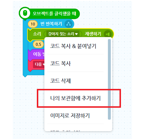 6. 2번째 탭의 엔트리로 이동한 후, "나의 보관함"을 클릭하면 앞에서 보관한 코드 블록이 들어가 있다.