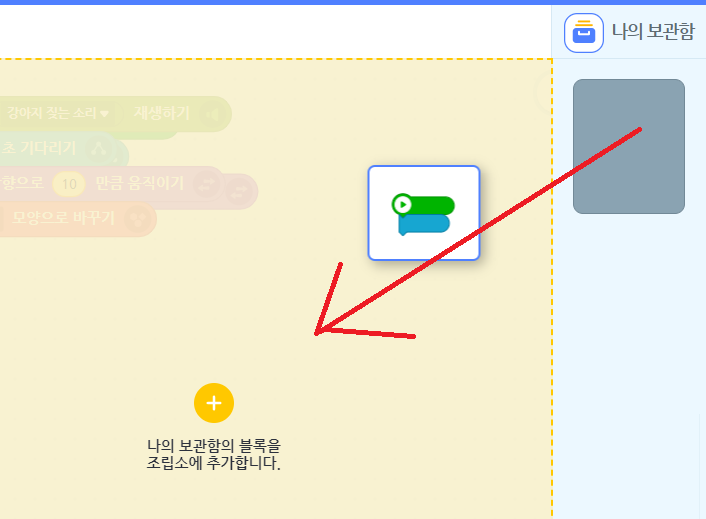 7. 보관함에서 사용할 블록을 마우스 드래그로 끌고오면 사용이 가능하다.