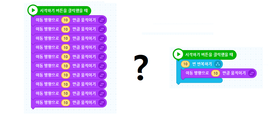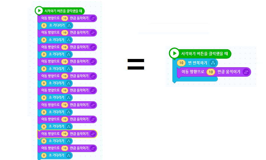 반복하기는 "이동방향으로 10만큼 움직이기"를 10번 실행한것 이므로, 아래와 같이 블록을 10번 붙여서 실행해도 반복문과 실행결과가 같을까??