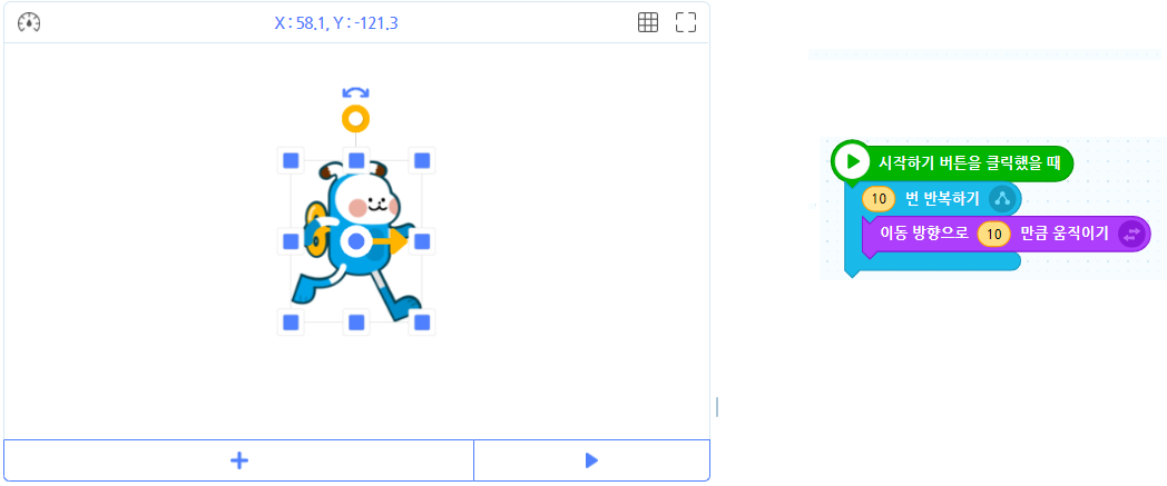 실행해보면 엔트리봇이 오른쪽으로 조금씩 10번 움직이는 것을 볼 수 있다.