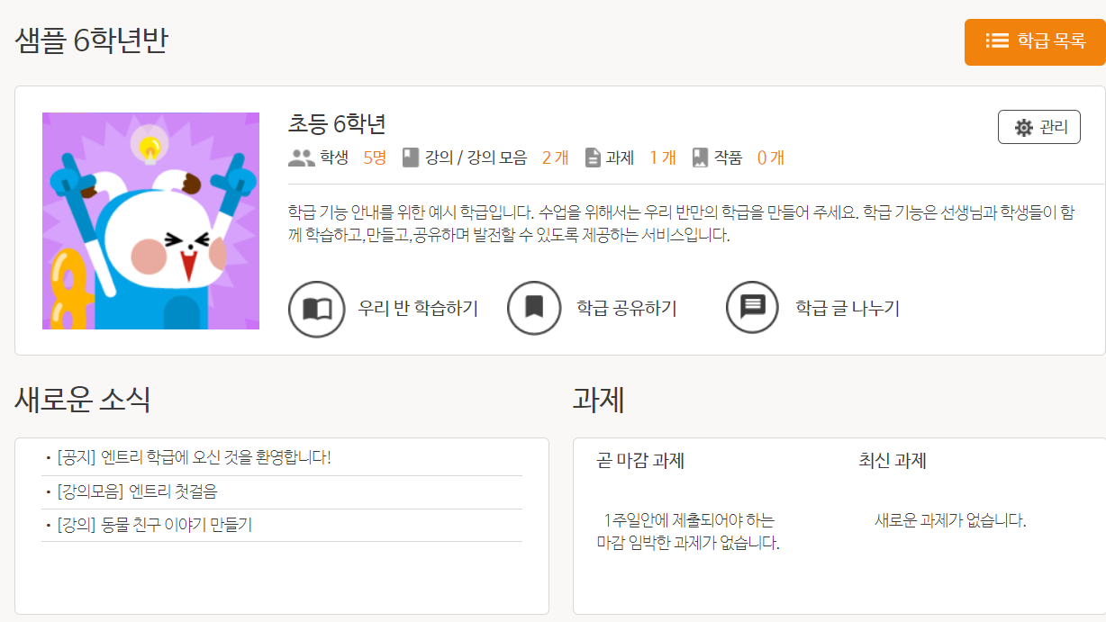 - 학급을 만들어 학생들을 관리하고 과제및 수업 내용 관리(엔트리 및 동영상 강의 만들기 가능)
