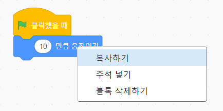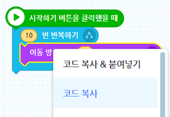 -"복사하기" 단일 기능만 있어서 복사하면 바로 붙여넣기까지 되어 버린다. 다른 스프라이트에 코드를 복사할때는 일단 화면에 붙여넣기한 코드를 다른 스프라이트로 마우스 드래그로 넣어주면 가능하다.